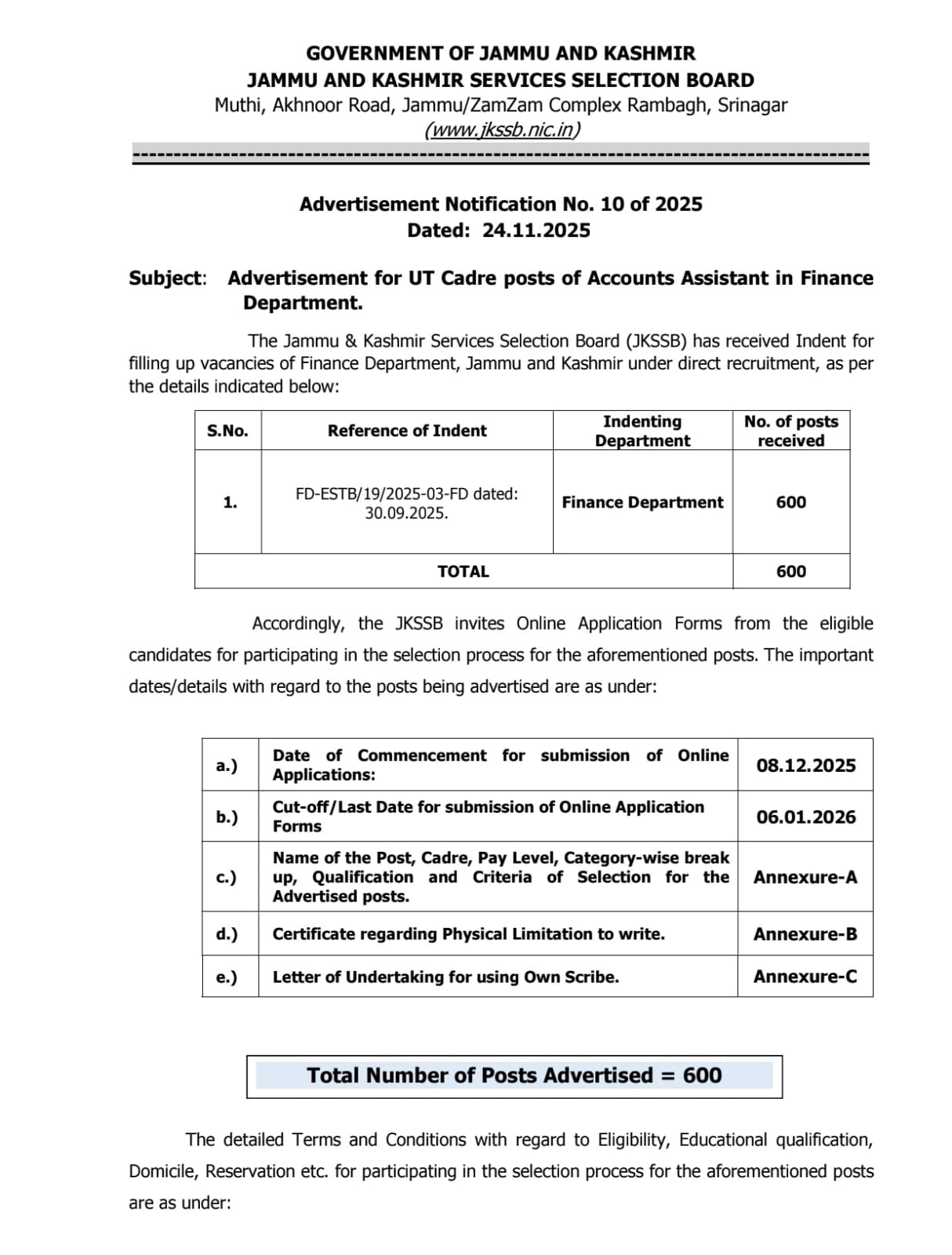 The Jammu and Kashmir Services Selection Board – JKSSB has officially published Advertisement Notification No. 10 of 2025 on 24 of November 2025 that is announcing a major recruitment drive for 600 Accounts Assistant vacancies in Finance Department of the UT of Jammu & Kashmir. This is one of the most significant recruitment notifications of the year 2025 which is offering large-scale government job opportunities to graduates seeking a stable and reputable career in the finance and accounting sector. The recruitment will be carried out through direct recruitment and interested candidates can submit their online applications starting form 08 of December 2025. In This article we will see into details of eligibility, important dates, application process and key highlights from the official notification.